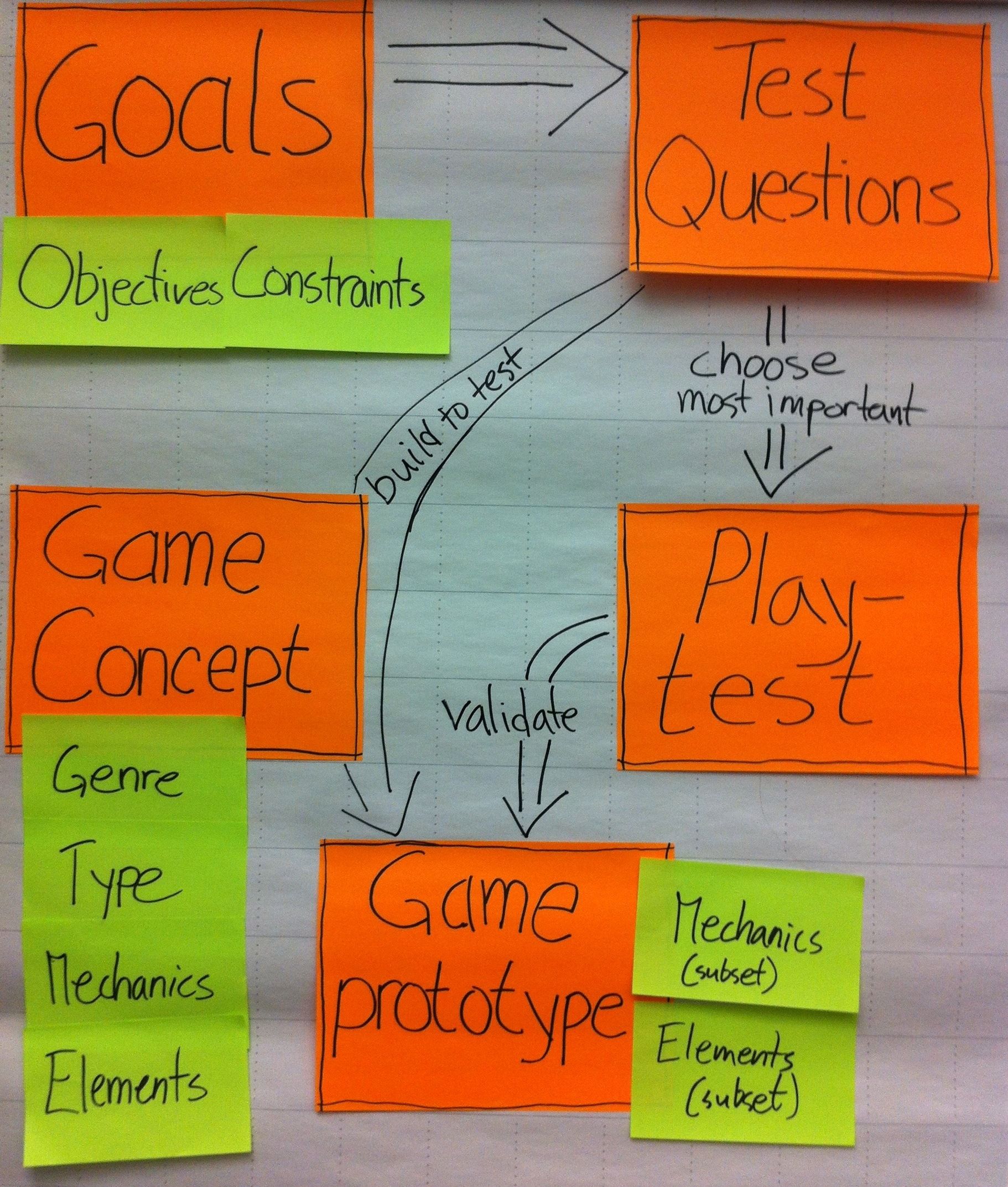 he design endeavor starts with setting the goals for the game. After that it is time to explore the possible game concepts and pick one (or a couple, or a combination of a few) as a starting point. After that a cyclic process of building game prototypes, performing playtests and learning from the results of playtests is utilized to refine the game concept until the game concept is deemed satisfying enough solution to the goals of the game.