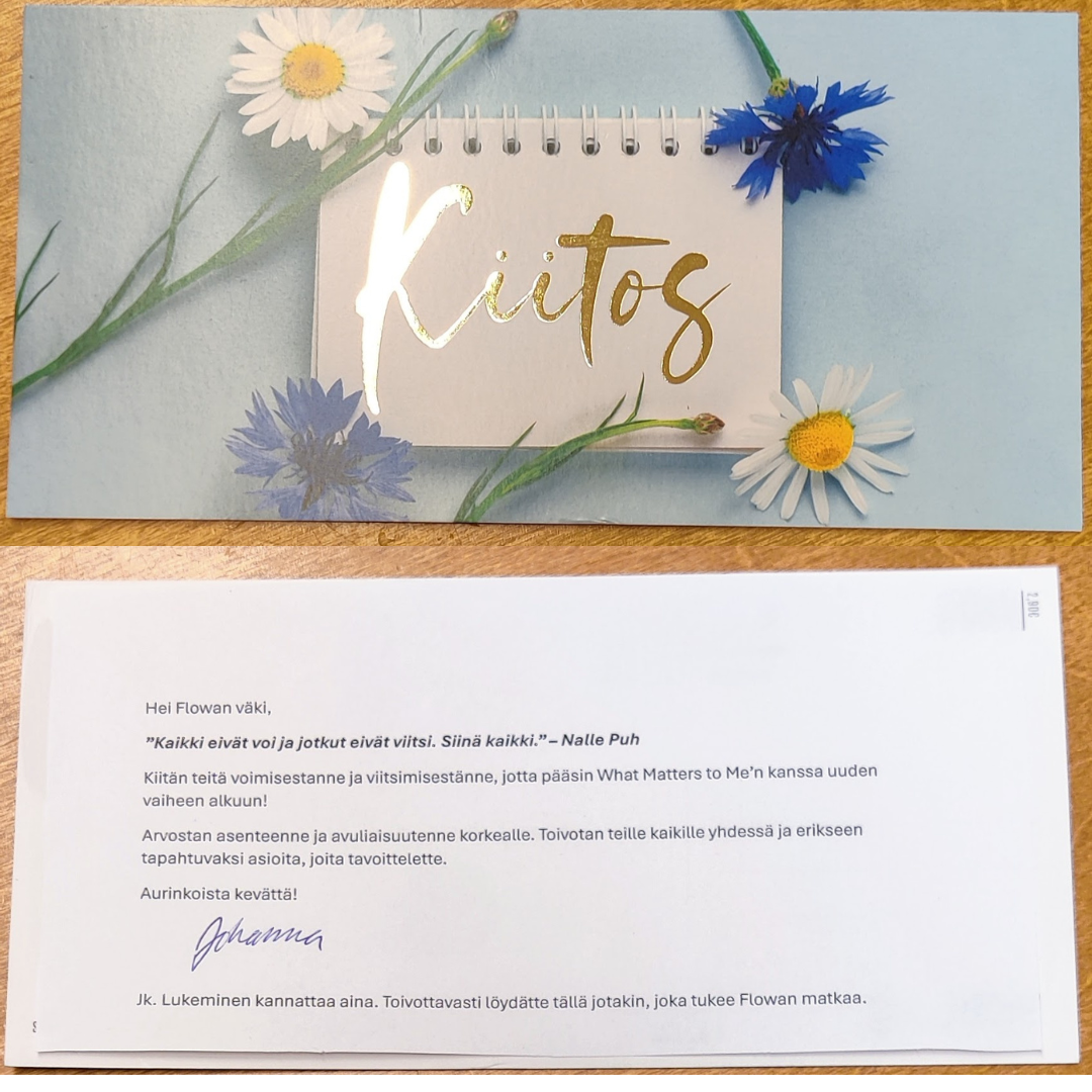 Veimme myös hallitusti päätökseen pitkään jatkuneen tuotekehitysyhteistyömme What Matters to Me -palvelun kanssa. What Matters to Me:n perustajan Johanna Mätäsahon kiitokset ilahduttivat meitä kovasti – juuri tälläistä kumppanikokemusta tavoittelemme kaikessa toiminnassamme!