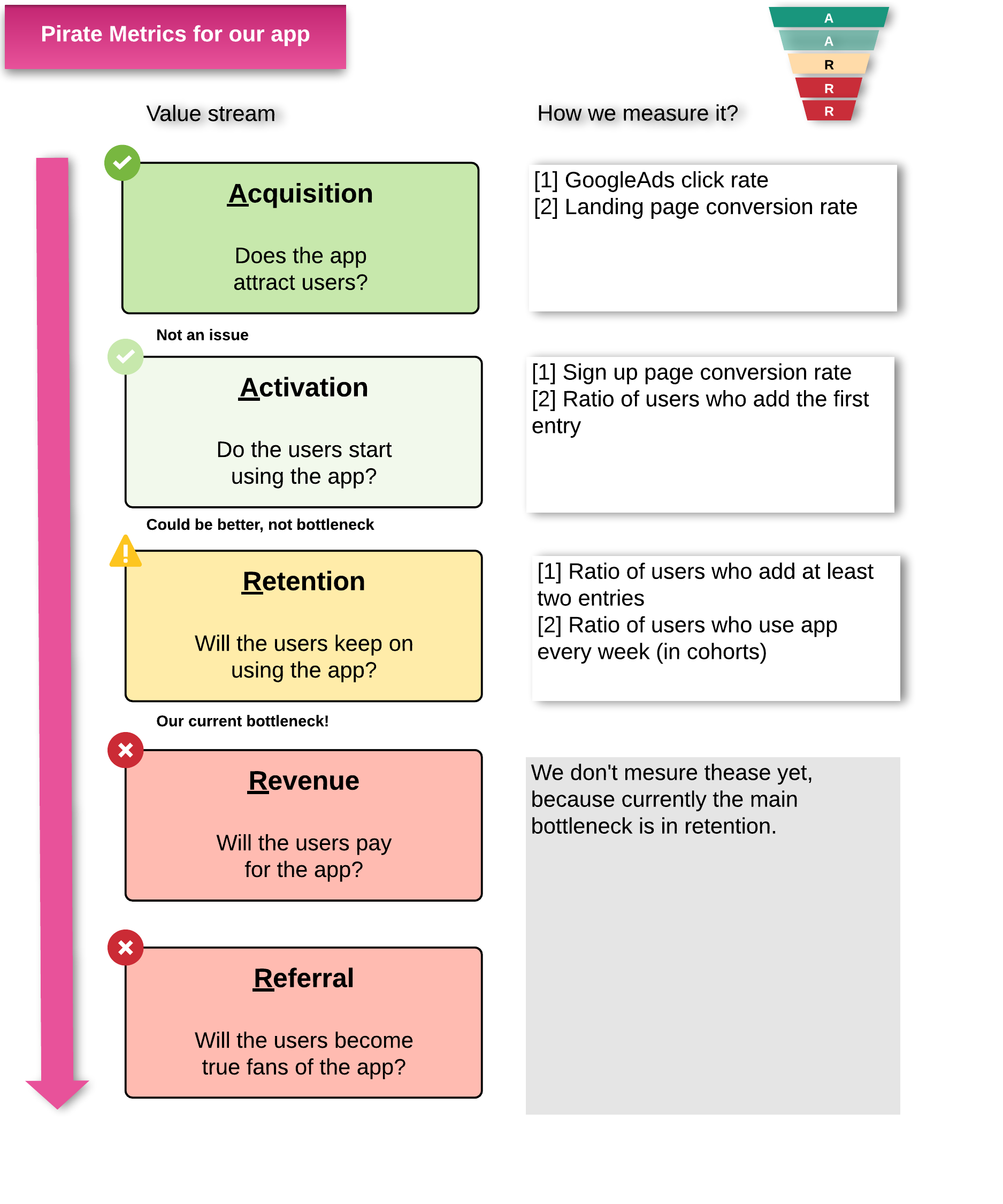 As a baseline for metrics, we use Pirate metrics (Acquire, Activate, Retention, Revenue, Referral). I’m not going to explain it here, but you will find more information easily by googling Pirate metrics. We use it partly because it’s easy to find benchmark data, and partly because it is a good match for this kind of service and hence, there is no reason to reinvent the wheel. We are currently trying to work with retention, and once it’s no longer the bottleneck we will then move to Revenue. It has been hard emotionally to not head to revenue too early - if you cannot keep users in the app when it’s free it’s unlikely that they will pay for it.