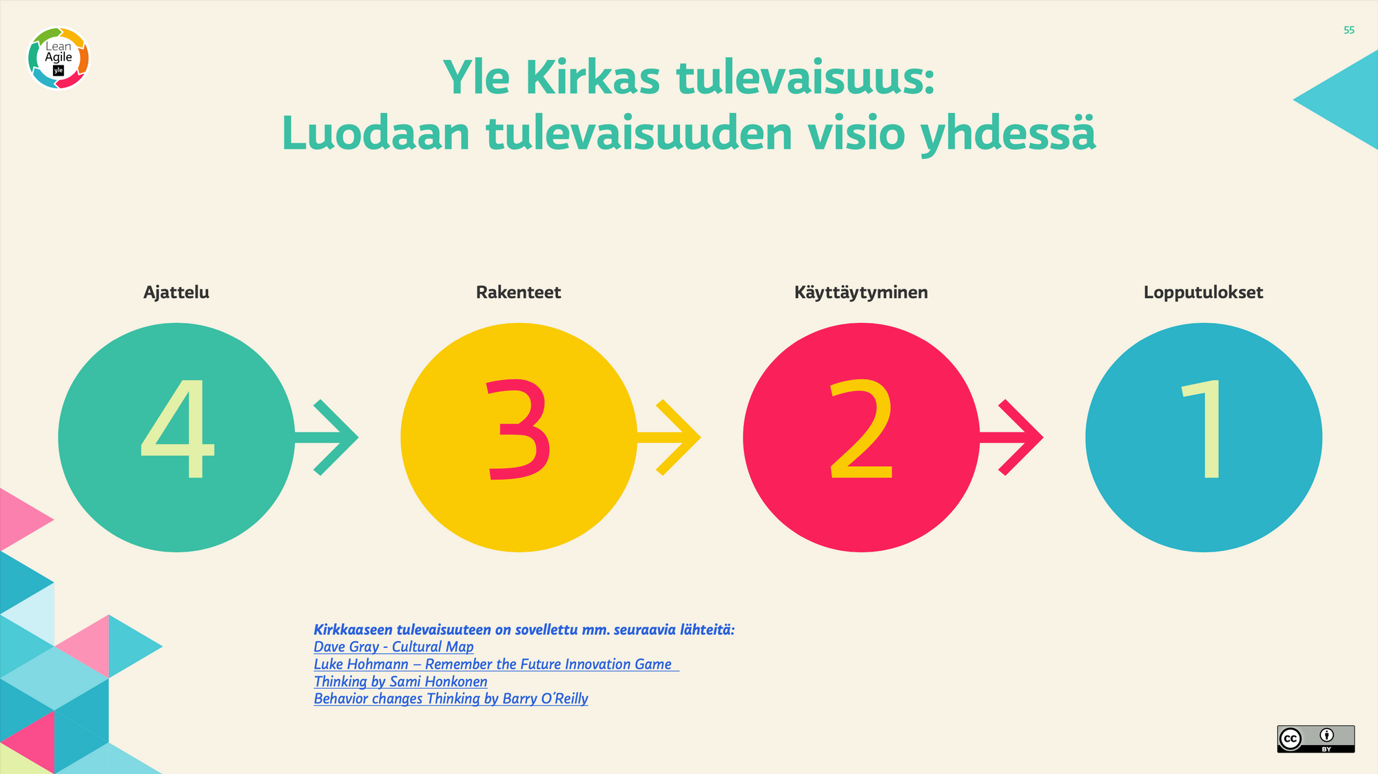 Ylen Lean Culture Toolkit 2.0:n Kirkas tulevaisuus -työtavassa kulttuurivisiota käsitellään osioissa käyttäytyminen, rakenteet ja ajattelu.