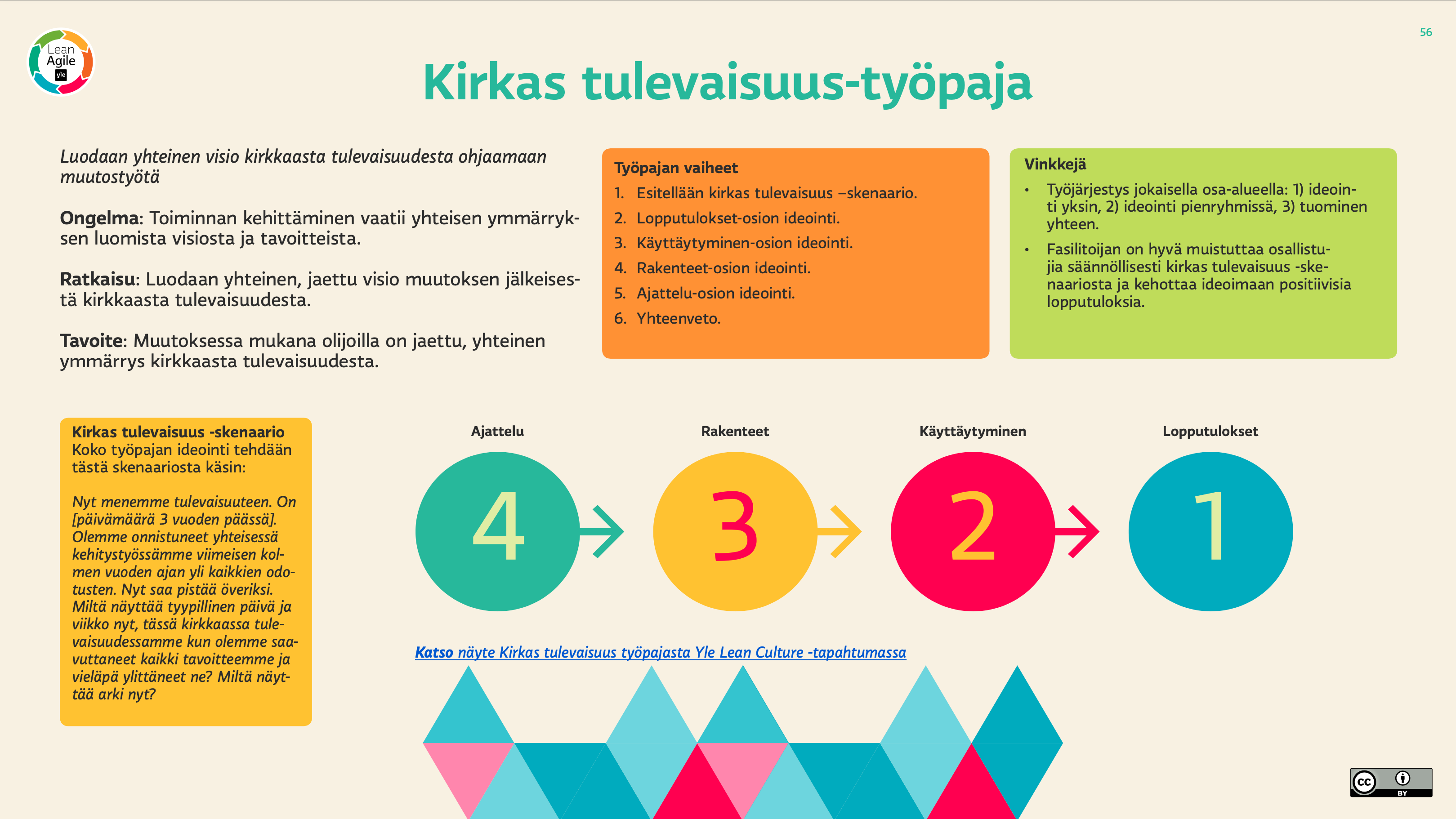 Ylen Lean Culture Toolkit 2.0:ssa oleva Kirkas tulevaisuus -tekniikka on hyvä esimerkki siitä, miten tälläistä skenaariotyötä voi fasilitoida.