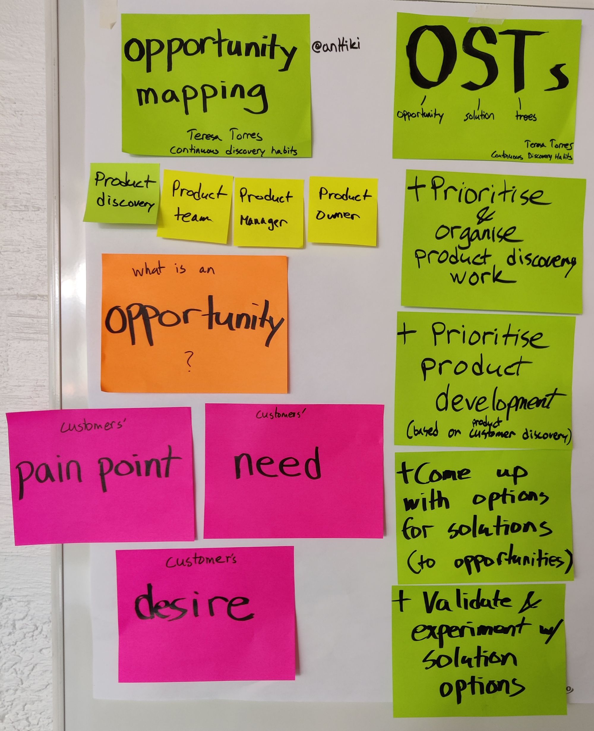 Siihen vastaa opportunity mapping. Se on product discovery -työn organisointiin ja priorisointiin tarkoitettu mallinnustapa. Opportunity mappingin on kehittänyt Teresa Torres. Siihen voi tutustua hänen kirjassaan Continuous Discovery Practices.