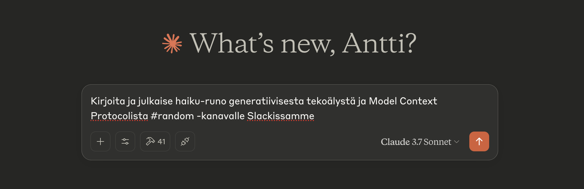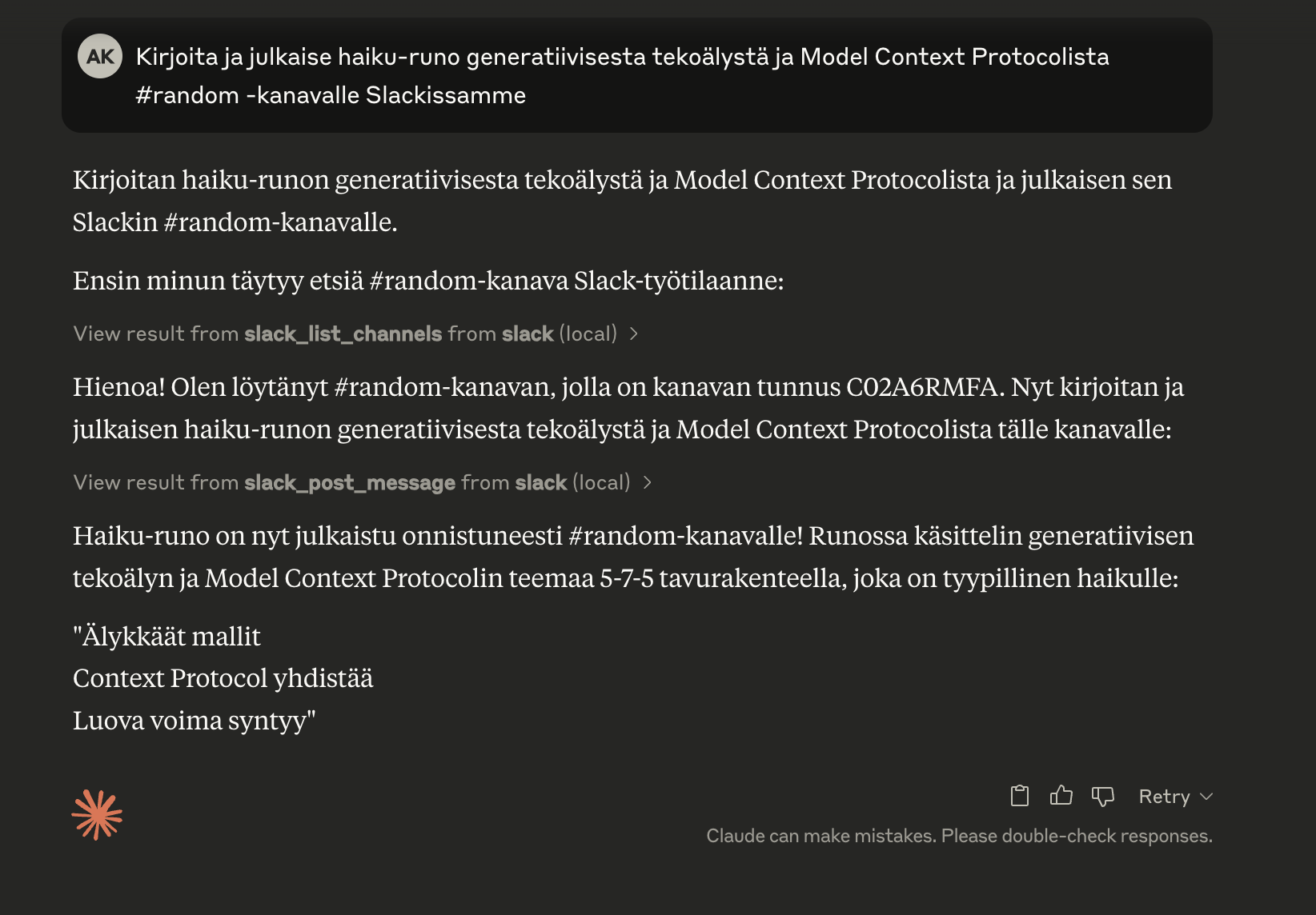 Käytän esimerkissä MPC:tä eli Model Context Protocolia ja siihen kehitettyjä valmiita MPC-palvelimia antamaan Claudelle nämä työkalut. 1. osassa kävin läpi ns. Hello World -esimerkin. Tässä osassa päästään sitten Slackin, Driven ja Notionin kimppuun.