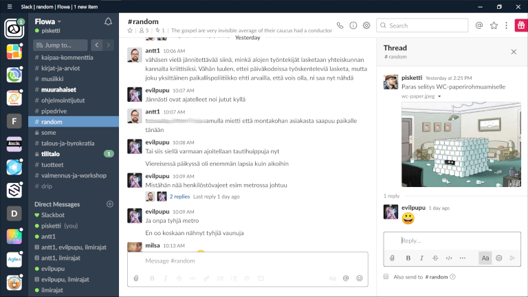 - Keep discussions on threads. You can and should start separate threads on specific topics. E.g. if someone asks something, reply in that thread. This way the channel doesnât get bloated and is easier to follow for everyone.