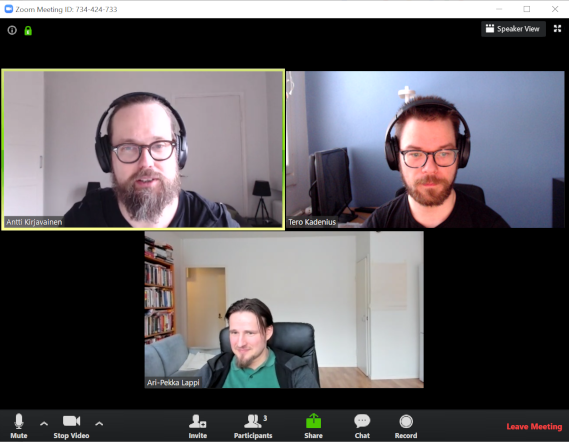 When you are working intensely such as when brainstorming or pair programming it is important to hear and see your fellow teammates. The choice of a video conferencing tool can make online meetings a breeze or a pain. There is no such thing as a perfect online meeting tool, however. Common complaints are eg. unstable connection, poor video or audio quality, difficulties in audio setup and unintuitive user interface. We have tried a whole bunch of tools over the years and the clear winner is Zoom (https://zoom.us/).